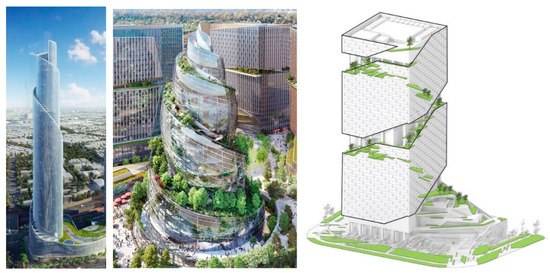 As stated in Section 3.10, the reification of several prototypes, under spiral-space typology, was proposed to classify the studied cases (Table 1). In other words, the aim of the prototypes discussed in Section 3.10 was to serve as a basic outline for understanding the ‘abstract’ concept of spiral-space typology in this study and for future works. The ‘capability’ of spiral-space typology (i.e., contributions to cities) was the key interest of this study, rather than building morphology. Thus, more possibilities regarding building morphology were expected, as the reserved ‘unknown’ prototype illustrated in Figure 6, as supplements. Some recent proposals from well-known design studios (e.g., KPF, SOM, and NBBJ) were observed (Table 2); most of the proposals are under construction and will be built up in 2025. Based on the classified prototypes illustrated in Figure 9, those proposals might vary somewhat in building morphology, which was not of key interest. In contrast, the function of this building typology is reserved and will make a certain contribution to citizens, such as incrementally generating public green space in cities.