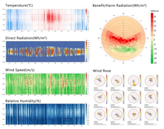 The city receives 1895 h of direct radiation annually. According to the Benefit/Harm Radiation chart in Figure 1 and the Building Solar Radiation chart in Figure 2, it is clear that solar radiation from the south is the most helpful radiation; however, it is not always appropriate for teaching space. We also need to limit solar radiation absorption from the east and west, especially in the afternoons when solar radiation from the west is very strong. Otherwise, the building’s interior area would collect a lot of solar radiation during the afternoon hours, making the internal climate too hot to dwell in and causing terrible glare problems.