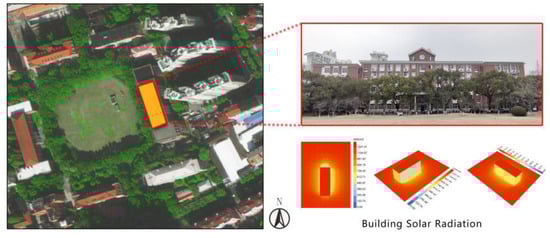 Shanghai’s four seasons are well-defined, with sufficient solar radiation. The building in Figure 2 is the subject of this study. It is called the 4th Academic Building and is located in Shanghai University. It has a reinforced concrete structure built in the 1990s, with fair fenestration on the facades and no sun visors for shading. Additionally, it is an east–west-oriented building facing 20° west of north. Its dimensions are 20 m length, 55 m width, and 25 m height. We ran the LB Incident Radiation simulation using a sky matrix from the Cumulative Sky Matrix component, which computed the incident radiation on geometry. After running an annual simulation of solar radiation, it could be found that the south and west directions had stronger solar radiation, 736.45 kWh/m2 and 613.71 kWh/m2, respectively, while the east-facing direction of building was weaker, at only 490.97 kWh/m2.