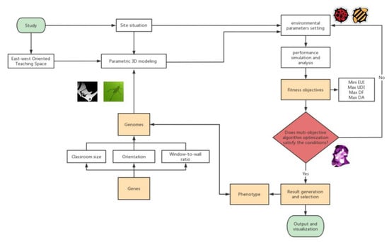 Some scholars have been researching digital architecture since the 1960s. From Computer-Aided Design [] to Evolution Architecture [] to Shape Grammars [], digital technology has set off a wave of exploration of architectural design theories and methods. Architecture design gradually shifted from top–down to bottom–up energy-saving design theory, then to digital building energy-saving design with the development and improvement of BPS software technology [,,]. It can take advantage of the complex calculation and arithmetic power of computers to break the previously experience-oriented design. Once the combined with the previous theories, it may provide architects with more opportunities to explore energy-efficient design. In reviews [,,,,], a simulation framework was developed to support decision-making in early design. The workflow was documented in detail: target selection, statistical methods, meta-modeling, CAD-BPS interoperability, parametric modeling, and optimization algorithms. It seems necessary to first discuss the overall design of the school from a macro perspective, and it is also vital to study the plan of teaching functional unit space on top of that. Ma Chengye [] conducted research on the generative design of primary and secondary schools with lighting based on the multi-agent system. He used python based on Rhino and Grasshopper platforms to calculate the spatial forms of educational buildings which are suitable for the Chinese context. We found that the layout created using this technique was equivalent to the scheme designed using standard methods in terms of logic when we looked at the plan and creation of a school as an example.