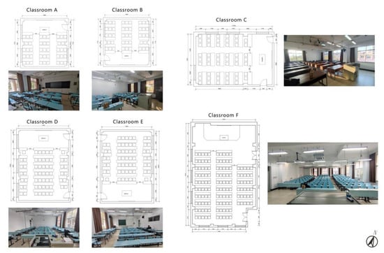 According to the previous studies in ref. [], the researchers selected seven different types of classrooms for the study in order to make the research more comprehensive. Thus, six representative classrooms were selected at Shanghai University (in an east–west-orientation building). It can be classified by classroom volumes: classrooms A and B are small-sized; classrooms C, D, and E are medium-sized; and classroom F is large-sized. The majority of east–west-oriented classroom scenarios may be covered by these three types of representative classrooms. So, these classrooms, with different facades, sizes, orientations, etc., have sample roles. The classroom plans and actual pictures are shown in Figure 4.