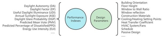 In this work, four fitness values were established to run optimization, UDI, DF, DA, and EUI, mainly from the perspective of lighting environment and energy consumption.