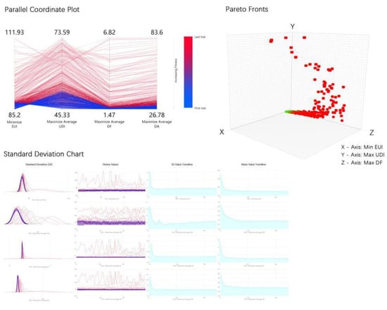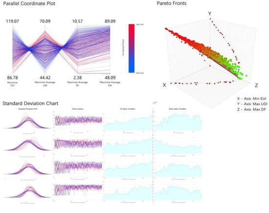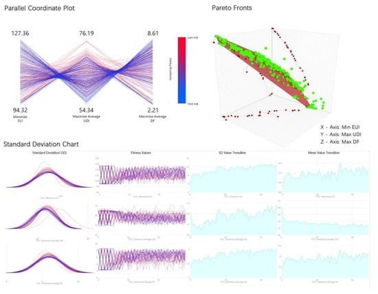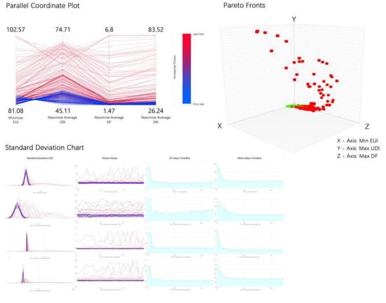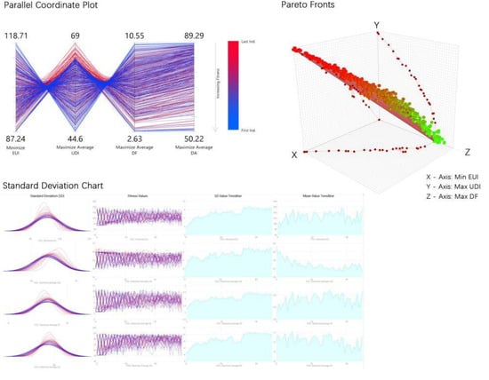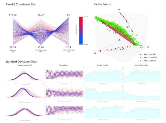 The Standard Deviation (SD) chart in Figure 7 shows the first to the last generation from red to blue. A good convergence boundary was formed after conducting the initial extensive search, and the UDI and DF indexes trendlines showed a certain upward trend at the later stage of the graph. The EUI indexes also stabilized above 100 kWh/m2, converging towards 110 kWh/m2. It showed that only the EUI index must be stable at around 100 kWh/m2 for the DF index to exceed 4.0%. At this point, the data are as follows: EUI fitness ranking = 200 (population: 0 to 1499 ranking); Gen. 27, Ind. 12; EUI: 100.05 kWh/m2; UDI: 68.80%; DF: 4.06%. Phenotype: Height = 3.2 m, Length = 7.5 m, Width = 7.5 m, Orientation = 26°, and WWR = 50%. This data set is similar to the Pareto Fronts.
