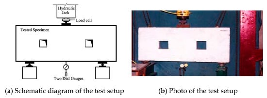 15]. The findings revealed that the ultimate strength of the tested deep beams with openings increased by 11%–94% compared to non-strengthened specimens. The tests have been recorded on reinforced High-Strength Concrete (HSC with