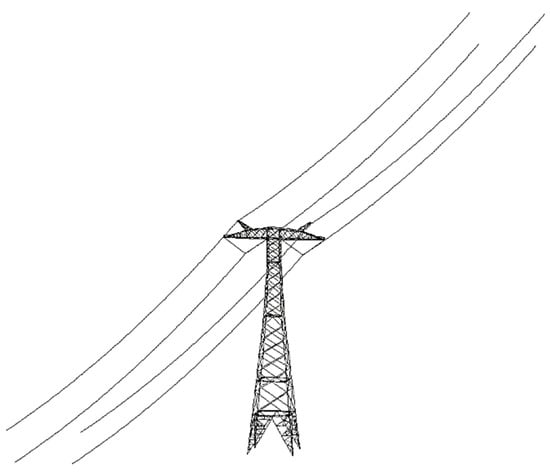 This paper uses ANSYS software for finite element modeling and details of transmission, as shown in Figure 1, and details of the transmission tower-line system, as shown in Figure 2. The transmission tower has strong geometric nonlinearity, so the members of the transmission tower are simulated by the BEAM188 element. BEAM188 supports warpage of thin-walled L-shaped openings. The transmission tower mainly bears the vertical load from the conductor, and the insulator string is hinged with the transmission tower.When the transmission line oscillates, there is a specific hanging effect. In modeling, the insulator string is simplified as a flexible cable, which is stimulated by the LINK10 element. In the current study, the damage to insulators is not considered, so the ideal elastic model is selected for the constitutive model of insulator materials. When using ANSYS for numerical simulation, the wire model is simplified according to the equivalent tensile stiffness to reduce the amount of computation. Since the distance between the two adjacent suspension points of the conductor is considerable and the lateral stiffness is minimal, the lateral stiffness is ignored. In the process of modeling, the conductor is simplified as a flexible cable that only bears axial tension, and the LINK 10 element is selected for simulation. The main material of the tower body and the primary material of the cross arm is Q345 steel, and the inclined material of the tower body and other auxiliary materials is Q235 steel. The transmission tower-line system is divided into 1332 elements, producing 1664 nodes. All degrees of freedom of the four nodes at the bottom of the transmission tower and at both ends of the transmission line are constrained. In this study, the interaction between the foundation and the transmission tower-line structure was not considered.