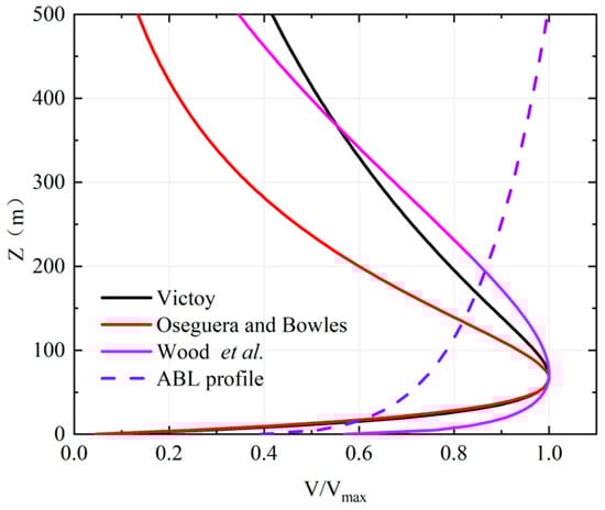 where is the vertical profile of the maximum mean wind speed and is a time function with a maximum value of 1. Vicroy [], Oseguera and Bowles [], and Wood et al. [] proposed three empirical models of horizontal wind speed and vertical wind profile of downburst, respectively. In order to better understand the influence of downburst with different intensities on the stability of transmission towers, the intensity of downburst can be changed by changing the value of Vmax. Therefore, the Vicory model is used for analysis and calculation in this paper. The expression is as follows: