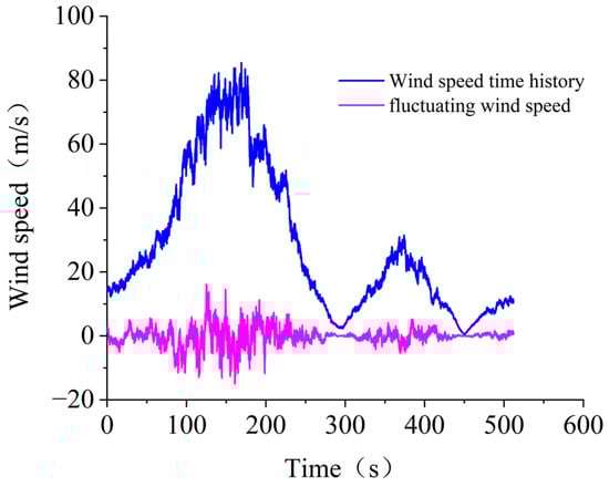 Because of the non-stationary characteristics of downbursts, Chen [] suggested that the maximum amplitude of fluctuating wind speed was about 0.25 times the mean wind speed at that time, and Chay [] suggested that it was 0.08–0.11 times the average wind speed at that time. Therefore, it can be assumed that the frequency domain characteristics of fluctuating wind speed do not change with time. The fluctuating wind speed time history is written as a time-varying amplitude modulation function and a Gaussian random process obeying the standard normal distribution. The expression of the fluctuating wind speed of a downburst is as follows: