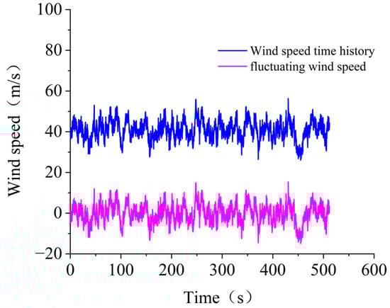 According to the above method, the time-history simulation of downburst wind speed is carried out, and the wind field simulation program is written by Matlab software. The main parameters of wind field simulation are as follows: simulation time is T = 512 s, N = 8192, and the time step is ∆t = 0.0625 s. Because the transmission tower-line system is a high-rise structure, the Kaimal spectrum is used as the target spectrum, reflecting height’s influence on the wind spectrum.