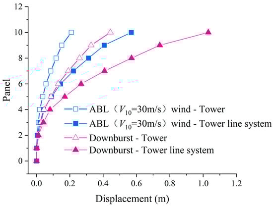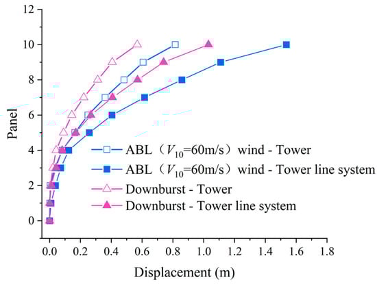 Figure 8 and Figure 9 show the displacement of the transmission tower and transmission line system under the action of two different basic wind speeds of ABL wind and downburst. In Figure 8, the basic wind speed V10 is 60 m/s so that the ABL wind can reach the same maximum wind speed as the downburst at the top of the tower. The maximum displacement of ‘ABL (V10 = 60 m/s) wind-tower line system’ is 1.53 m, which is 1.88 times that of ‘ABL (V10 = 60 m/s) wind-tower’ and 1.50 times that of ‘Downburst-Tower line system’. It can be seen that when the basic wind speed V10 is 60 m/s, the ABL wind is more destructive to the transmission tower. However, the basic wind speed V10 = 60 m/s in this case rarely occurs in engineering applications. In Figure 9, according to the ‘Code for design of 110 kV~750 kV overhead transmission line []’, transmission tower-line system design basic wind speed V10 takes 30 m/s. The maximum displacement of the ‘Downburst-tower’ is 0.44 m, which is 2.11 times that of the ‘ABL (V10 = 30 m/s) wind-tower’. The maximum displacement of the ‘Downburst-Tower line system’ is 1.03 m, which is 1.83 times that of ‘ABL (V10 = 30 m/s) wind-tower line system’. The maximum displacement in the ‘Downburst-Tower line system’ is 2.34 times that in the ‘Downburst-Tower’; the maximum displacement in the ‘ABL (V10 = 30 m/s) wind-tower line system’ is 0.56 m, which is 2.71 times larger than that in the ‘ABL (V10 = 30 m/s) wind-tower’. Through the above comparative analysis, it can be concluded that the influence of the conductor on the displacement response of the transmission tower cannot be ignored; when the basic wind speed (V10 = 30 m/s) in the design code of the transmission tower is used, the displacement response of the transmission tower under downburst is much larger than that under ABL wind load.