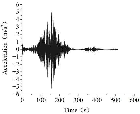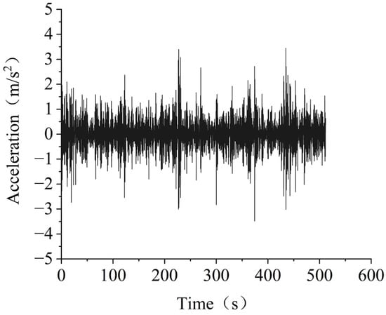 Figure 10 and Figure 11 show the acceleration response of the transmission tower top under the downburst and ABL wind loads. It can be seen that the time history of acceleration response at the top of the tower has the corresponding peak values to the displacement time history, and there are two relative peaks. The acceleration under the action of the downburst has a large fluctuation area from 100 s to 250 s. At about t = 150 s, the peak acceleration appears, which is about 5.03 m/s2, and the acceleration time-history shows the second peak, and the fluctuation amplitude is less than the first one. The peak acceleration under the action of the ABL wind is about 3.19 m/s2. Therefore, the short-term increase in the acceleration of the transmission tower caused by the downburst wind load may cause damage to the transmission tower-line system.