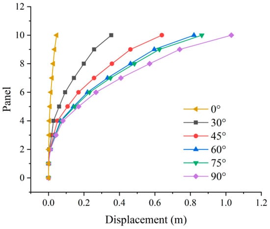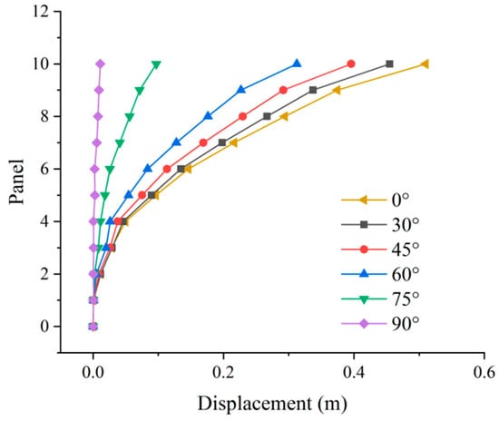 To analyze the response of the transmission tower under different wind attack angles, the dynamic time history analysis of the transmission tower-line system under different wind attack angles is carried out. Through the time-history analysis, the dynamic response results of the transmission tower-line system under the action of 0°, 30°, 45°, 60°, 75°, and 90° of fluctuating wind are obtained, respectively. Figure 12 is the schematic diagram of the wind attack angle. Figure 13 and Figure 14, respectively, show the top displacement responses of the nodes in the Y-direction (90° wind attack angle) and X-direction (0° wind attack angle) of the transmission tower-line system at different tower heights under the action of fluctuating wind at different wind attack angles. When the height of the transmission tower-line system from the ground remains unchanged, with the wind attack angle from 0° to 90°, the displacement of the transmission tower-line system in the Y-direction gradually increases and reaches its maximum value at the wind attack angle of 90°. At this time, the coupling effect between the transmission tower and the conductor is significant. The conductor increases the windward area and transmits the wind load to the transmission tower through the insulator, which greatly increases the displacement of the transmission tower under the action of a downburst. Then the displacement response also reaches its maximum value. At 0° attack angle, the displacement in the X-direction reaches its maximum. At 90° wind angle of attack, the transmission tower-line system displacement in the Y direction is greater than the displacement in the X direction under 0° wind angle of attack. Thus, the attack angle of 90° is the most unfavorable for the transmission tower-line system.