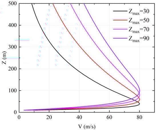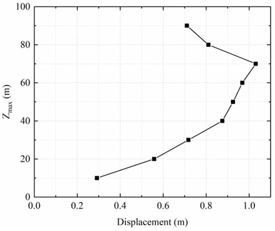 To further investigate the effect of the downburst on the transmission tower-line system, different downburst wind loads can be simulated with different Zmax values. Figure 15 is an average wind profile for the Vicory model with different Zmax values. It can be seen from Figure 16 that when Zmax is from 10 m to 70 m, with the increase in Zmax, the maximum displacement of the transmission tower also rises to the maximum at Zmax = 70 m, and then begins to decrease rapidly. This is because when Zmax = 70 m, it is very close to the tower height of the transmission tower. When Zmax = 90 m, the maximum wind speed does not appear in the range of the height of the transmission tower, resulting in a decrease in the displacement of the transmission tower. When Zmax = 10 m ~ 60 m, although the maximum wind speed of a downburst occurs in the height range of the transmission tower, the position is low, and the wind speed above Zmax decays very quickly, so the higher the position of the maximum wind speed, the greater the displacement of the transmission tower. Therefore, it can be concluded that when Zmax is within the height range of the transmission tower, with the increase in Zmax, the greater the influence on the displacement of the transmission tower, and when Zmax exceeds the tower body range, the smaller the influence on the displacement of the transmission tower.