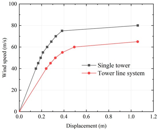 In the previous calculation of the transmission tower-line system under downburst wind load, Umax was taken as 80 m/s. Based on the linear assumption of materials, the transmission tower will yield under the action of a downburst under this strength. To obtain the characteristic response of the structure at all levels of wind load, considering the nonlinearity of materials, the harmonic superposition method is used to simulate the fluctuating wind speed time history at each section height of the transmission tower with a maximum average wind speed of 40–80 m/s. The displacement response of the single tower and tower line system at each level of simulated wind speed is analyzed by ANSYS, and the displacement time history of the tower top is obtained. The maximum displacement value can be obtained by comparison. Figure 17 shows the top displacement of the transmission tower and its relationship to the corresponding wind speed.