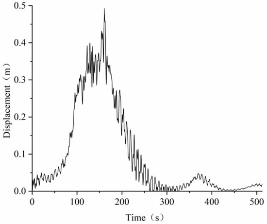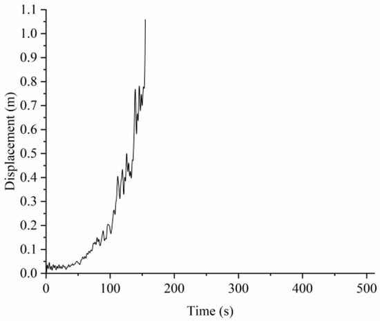 It can be seen from Figure 17 that the maximum displacement at the top of the transmission tower is 0.38 m with Umax = 75 m/s. In continuing the time course analysis of the structure under the downburst with Umax = 80 m/s. When ANSYS is running for the calculation of 148 s, the displacement of the transmission tower reaches 1.05 m. At this time, the finite element calculation results do not converge. Under the downburst wind load corresponding to Umax = 75 m/s and Umax = 80 m/s, the Umax displacement of the transmission tower is close to the horizontal. According to the dynamic increment method, the dynamic instability of the transmission tower occurs under the condition of Umax =80 m/s. According to the Budiansky–Roth criterion, if the structure responds violently under a small load increment, it can be judged that the dynamic instability of the structure has occurred. Figure 18 and Figure 19 are the displacement time history of the transmission tower-line system under the action of a downburst with Umax = 60 m/s and Umax = 65 m/s., The extreme value appears around 150 s, which is similar to the downburst wind speed time history. Similarly, it can be seen that the tower-line system undergoes dynamic instability under the action of a downburst with Umax = 65 m/s. and conductors greatly reduce the transmission towers’ stability.