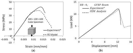 Verification of numerical material models with adopted experimental result * []: (a) Concrete Compression Results; (b) GFRP Beam Bending Results.