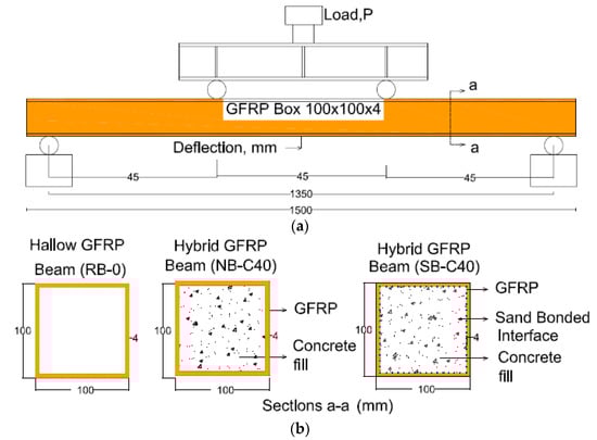 Engineers have always sought new quests to increase the effectiveness of their design, and composite structures are one of these effective inventions to accommodate in many structures. Reinforcement materials, such as steel and fiber reinforced polymer (FRP), are used to cover concrete’s weakness under tensile stresses []. Even though FRP reinforcement does not have plastic behavior and negligible shear strengths in the transverse direction [], FRPs offer high tensile strength with light material weight along with other promising properties [,]. Different forms of FRPs are commonly used in civil industries and are becoming attractive in research activities. Glass FRPs (GFRPs) are generally preferred types of FRPs due to their lower cost and easy access relative to the other counterparts, i.e., carbon and aramid [,]. The pultrusion method provides standardized, cheaper, and faster production for hollow structural members []. FRP pultrusion method offers new design concepts to the new structures and existing structures by strengthening applications []. The use of pultruded GFRP with infilled concrete has been investigated as column members as an alternative to the wrapping with FRP fabrics, and these members are typically subjected to the axial and lateral loads together. Ultimate strength, stiffness, and ductility improvements have been reported for the GFRP columns infilled with concrete columns [,,,]. Under seismic loading conditions, the use of hybrid FRP columns was suggested [] due to their extensive lateral deformation capacities. Similarly, the flexural performance of the hybrid beams including fully and partially concrete-filled hollow GFRP sections has been studied by several researchers, [,,,,], load capacity and initial stiffness improvements were reported, and partially filled hollow GFRP sections did not cause significant load capacity drops; therefore, optimization of partially concrete-filled GFRP sections was suggested by []. Additionally, deflection reductions with hybrid beams allows for utilizing increased span lengths when compared to hollow GFRP beams that have the same cross section [].