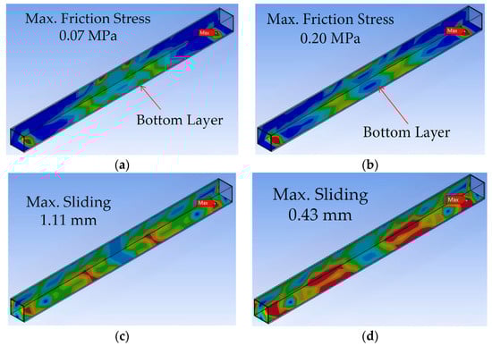 The bond-slip behavior of the hybrid beams was investigated by extracting their maximum friction stresses and sliding distances over time. The intensity of the friction stresses increased as the friction coefficient was increased for the roughened surfaces, and the changes due to friction coefficients are given in Table 6. The upper and lower bound friction coefficients (fully bonded and 0.001) from the FE models were presented within the same table. Three-dimensional schematic views of the contact elements for the NB-CL40 and SB-CL40 beams at their maximum stresses and sliding distances are shown in Figure 3a–d. The friction stresses were concentrated at load applied lines, where the normal pressures are expected to be high, in Figure 3a,b for the NB-CL40 and SB-CL40 beams, respectively. In parallel to the stress concentrations, sliding distances became smaller when the inner surface treatment quality was increased as seen in Figure 3d for SB-C40 beams. The localized stress and sliding contours for the NB-C4L0 beam in Figure 3a,c were more distributed along the contact length when compared to the SB-CL40 beam in Figure 3c,d. Therefore, the provided maximum shear stresses at the interface can be considered 0.07 MPa and 0.24 MPa inner bearing strengths for the concrete-filled GFRP box beams that have natural surface preparations and sand-bonded surface preparations, respectively. The relation between the surface friction coefficients and inner bearing strengths that form the numerical analysis are given in Table 6. On the other hand, there is not any clear definition of the inner bearing strength of the concrete-filled GFRP sections in practice. However, the natural bond strength at the interface of steel and concrete composite members can be predicted using Equation (2) given in AISC 360 (2016) for comparison purposes, and it was predicted to be 0.84 MPa using the same equation and geometrical properties of the GFRP sections, which cannot be larger than 0.7 MPa between the steel and concrete composite sections. Nevertheless, the numerically predicted inner surface bearing strengths given in Table 6 were obtained for less than the code-based calculated value of 0.7 MPa. This concluded that the inner surface bond-slip behavior can be accurately included in the analytical design and numerical modeling approaches for the flexural design of concrete-infilled GFRP beams. Further experimental studies are necessary to calibrate the inner surface strengths due to different surface treatments.