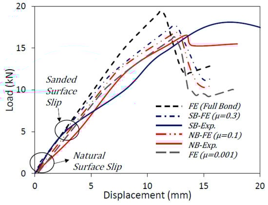 Frictional coefficients in the FE models were varied from unbonded to fully bonded contact with 0.1 increments, and load-deflection curves of the experimentally studied hybrid beams [], NB-CL40 and SB-CL40, were compared with the FE model results. It was shown that the peak loads were predicted with a minimal error by choosing 0.1 and 0.3 friction coefficients for normal, NB-CL40, and sand-bonded, SB-CL40, hybrid beams, respectively. The maximum difference between experimental and numerical load capacities was 2.4% and 1.7% among the considered hybrid beams. These results showed that the ultimate load capacities can be approximated with negligible error using numerical analysis. In another numerical study, interface friction coefficients of 0.25 and 0.50 were suggested in axially loaded small-scale columns [], and two caused negligible differences for the axial load capacities. In the bending of the hybrid beams, the difference can reach up to 19.6% for flexural load capacities. On the other hand, vertical deflections where the ultimate load capacities were captured produced relatively larger errors (7.4% and 29.7%) for the NB-CL40 and SB-CL40 beams using the FE models. Load-deflection curves in Figure 4 showed that the sudden load drop did not develop with the sand-bonded surface treatment. Nevertheless, the peak load capacities were considered as a reference value to validate the FE models and surface friction coefficients. Load-deflection curves from the FE model and experimental results are plotted in Figure 4 with the selected frictional coefficients including the upper and lower bounds. The flexural stiffness of the hybrid beams using the FE models was predicted slightly more than the flexural stiffness of the experimentally tested beams, and gradually increased in parallel to the increased friction coefficients. This behavior can be seen for the sand bonded SB-CL40 hybrid beam in Figure 4; however, stiffness started to drop at about 5 kN when the critical shear stress was reached at the interface. Later, it dropped below the stiffness of the normal bonded beam, NB-CL40, which was normally unexpected and inconsistent with the FE results. Further experimental studies are needed to understand the missing knowledge of the effects of surface treatments for the concrete-infilled hybrid GFRP beams.