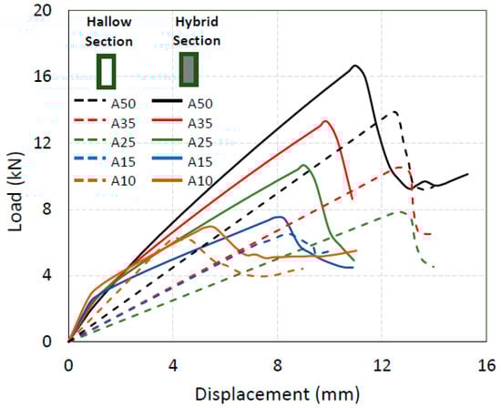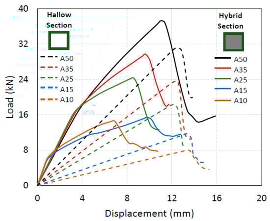 The performance of the hybrid beams was presented by the amount of GFRP material in a total cross-section. The areal ratio of the GFRP and concrete was varied by changing the wall thickness of the GFRP beam while keeping the cross-section constant. Areal ratios (10%, 15%, 25%, 35%, and 50%) of GFRP material in a cross-section were represented by the A10, A15, A25, A35 and A50 labels from Figure 5, Figure 6 and Figure 7. For comparison purposes, hollow and hybrid beams’ load-deflection curves were included in these figures. Three different hollow and hybrid beam models with square, SB, rectangular, RB and tubular, TB, cross-sections were investigated, and their results will be compared and discussed in this section. The GFRP beams were compact sections considering the filled steel box and tubular section definitions []. These beams are labeled as cross-section—areal-ratio—hollow (O) or hybrid (H) beam order, and SB-A10-O, for example, can be read as a hollow square beam with 10% GFRP in a cross section.