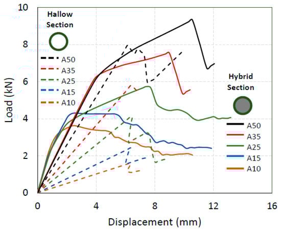 Tube GFRP section was another geometrical consideration for the effectiveness of the hybrid beams. The constant gross area in the tubular beams was 7854 mm2 (100 mm diameter) and the wall thicknesses were assigned according to the areal ratios of GFRP from 10% to 50% of the total gross area. Hollow tubular beams showed linear load-deflection curves in Figure 7 until the GFRP reaches rupture stresses such as the hollow square and rectangular beams due to linear material properties. Gradual load capacity increase was obtained with the increased GFRP wall thickness, a maximum relative gain of 84% was obtained by the tubular hybrid TB-A10-H beam, and it was gradually reduced to 21% with the increased GFRP’s areal ratio in the cross-section. One major difference were the deflections at the peak loads for the tubular sections when compared to the hybrid box GFRP sections. The deflections of the hybrid tubular beams before the first inflection point were reduced in descending order as the GFRP thickness was increased, as shown in Figure 7; however, the deflection at the ultimate load capacities was obtained more than their hybrid beam models’ when the tubular section becomes more compact, i.e., TB-A35-H and -TB-A50-H beams.
