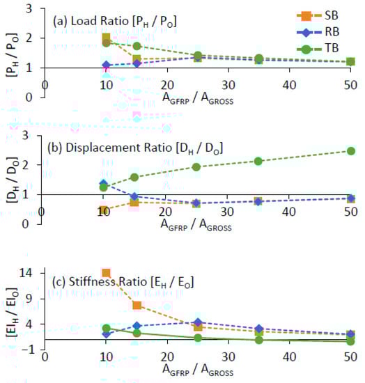 The detailed graphical representation of all three cross-sections in a hybrid beam model under flexure is shown in Figure 8 for the normalized load, displacement and stiffness variations by changing the GFRP amount in a total cross-section. The square section is more efficient for the use of load capacity, deflection and stiffness enhancements. When a 25% GFRP ratio in a cross-section was provided in cross section all the sections’ normalized flexural performances became similar except for the deflections of the tubular section. The change of elastic modulus in a cross-section yielded a poor flexural performance for tubular sections. Even though the tubular section had some load capacity and stiffness gain with filler concrete in Figure 7, the tubular sections should not be preferred when the confining GFRP section has a lower modulus than the filler concrete. Additionally, the reduced concrete stress block and reduced moment arm in a tubular shape is expected to yield reduced flexural performances compared to the box shapes. On the other hand, filler material postpones the local buckling of compression flanges for slender tubular sections.