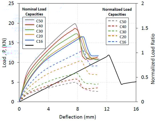 Nominal and normalized load deflection curves of hybrid beams with varied concrete.