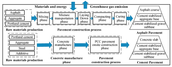 Greenhouse gas (GHG) emissions have long been a source of concern around the world due to their contribution to climate change, which endangers the natural and human environment and ecosystems [1]. Many countries have devised strategies to reduce GHG emissions. China has announced that it will reach a peak in carbon emissions by 2030 and achieve carbon neutrality by 2060 [2]. Roads, as an important mode of transportation, emit considerable amounts of GHG throughout their entire life cycle [3]. Large amounts of roads have been built in recent years all over the world, particularly in developing countries, and over 25 million kilometers of new roads will be built by 2050 [4]. As the world’s largest developing country, China faces a significant challenge of increasing GHG emissions due to its extensive road network [5].