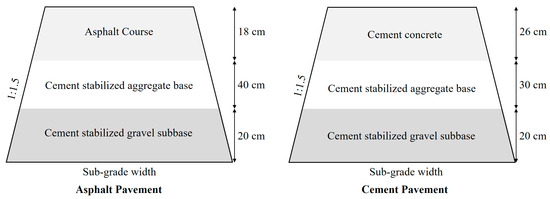As illustrated in Figure 2, a typical road has three layers. The surface of an asphalt pavement is made of hot mixture asphalt course, the base is made of cement stabilized aggregate, and the subbase is made of cement stabilized gravel. A cement pavement has a cement concrete surface, a cement stabilized aggregate base, and a cement stabilized gravel subbase. The slope of the road is 1:1.5 [28].The thickness of each layer are derived from the Ministry of Transport [29], which provides the Chinese road structure standard, as shown in Table 1.