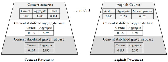 Combining data from previous studies on road size and material components of each layer [18,21,30], mass density of each layer are obtained, as shown in Figure 3.