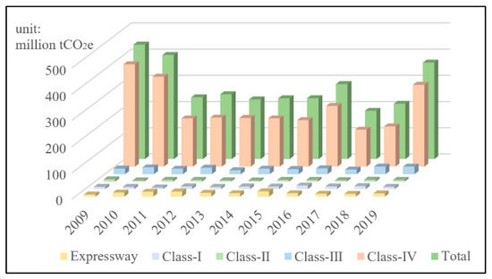 The type of road also has an impact on the outcome of the calculation of GHG emissions from road construction. Different road types, such as highway [22], interstate road [23], interurban road [24], and rural road [25], are used to calculate carbon emissions. The road structure in China divides roads six hierarchies: expressways, Class-Ⅰ roads, Class-Ⅱ roads, Class-Ⅲ roads and Class-Ⅳ roads. It was reported that expressways, Class-Ⅰ roads, and Class-Ⅱ roads are mostly paved with asphalt. Cement concrete pavements are used on Class-Ⅲ roads and half of Class-Ⅳ roads [18]. Carbon emissions from different types of roads vary greatly due to differences in construction scale, construction environment, and construction technologies.