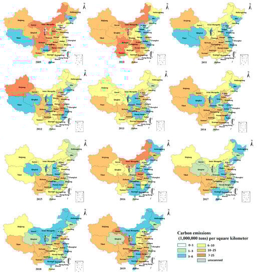It is also indicated in Figure 7 that GHG emissions from road construction are shifting from east to west regions. When the years 2009 and 2019 are compared, almost all of the eastern regions on the map have changed from yellow to green in 2019, while many provinces in the western region have turned orange, indicating a significant decrease of GHG emissions in eastern regions and increase in western regions. Transportation infrastructure is widely regarded as a valuable tool for a region’s economic development [35]. Since the reform and opening up policy was implemented in 1978, the eastern regions have experienced rapid economic growth, and there is a polarization between eastern coastal and inland regions [36]. Later policy centered on western region development resulted in a large amount of transportation infrastructure construction in western regions. As a result, the center of GHG emissions from roads shifted from the east to the west.