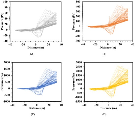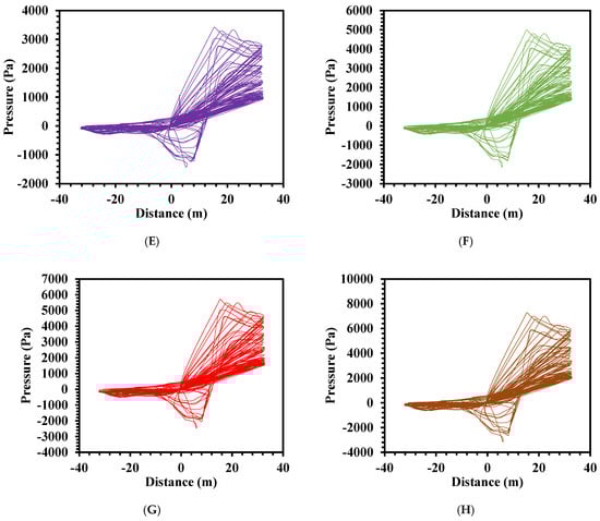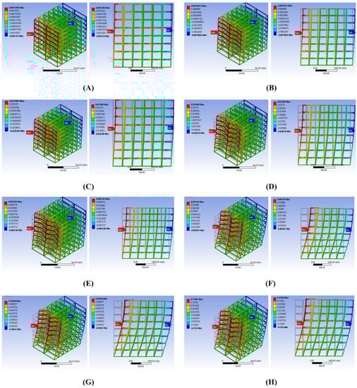 Dynamic wind flow pressure results applied on the MSC2 modular system under (A) normal, (B) tropical depression, (C) tropical storm, (D) cyclone 1st, (E) cyclone 2nd, (F) cyclone 3rd, (G) cyclone 4th, and (H) cyclone 5th wind flow loading categories.