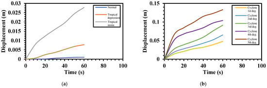 Displacement behavior of MSC1 under (a) normal, tropical depression, and tropical storm wind flow categories and (b) cyclone wind flow categories.