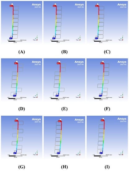 Structural performance of MSC1 under (A) normal, (B) tropical depression, (C) tropical storm, (D) cyclone 1st, (E) cyclone 2nd, (F) cyclone 3rd, (G) cyclone 4th, and (H) cyclone 5th wind flow loading categories.
