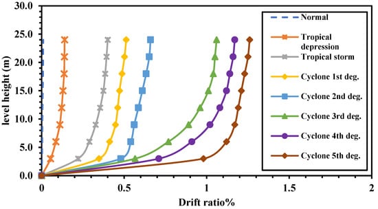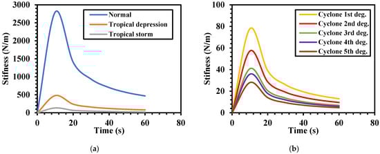 MSC1 stiffness performance under (a) normal, tropical depression, and tropical storm wind flow categories and (b) cyclone wind flow categories.