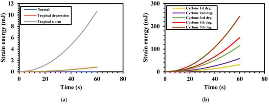 MSC1 stain energy performance under (a) normal, tropical depression, and tropical storm wind flow categories, and (b) cyclone wind flow categories.