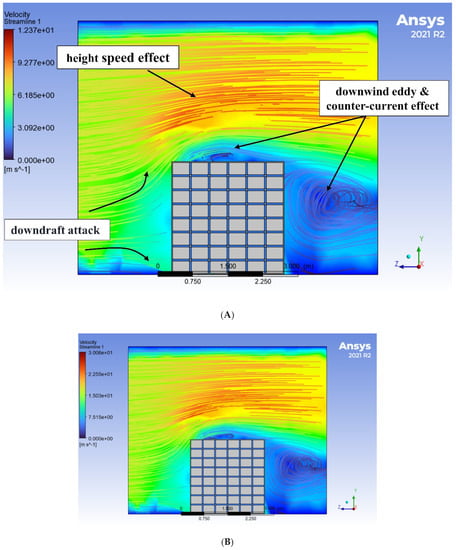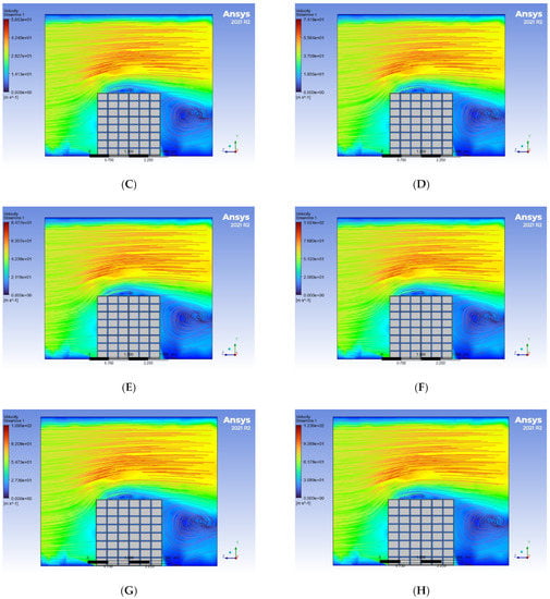 Wind velocity results of the MSC2 modular system under (A) normal, (B) tropical depression, (C) tropical storm, (D) cyclone 1st, (E) cyclone 2nd, (F) cyclone 3rd, (G) cyclone 4th, and (H) cyclone 5th wind flow loading categories.