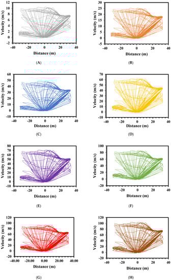 Wind flow velocity applied on the MSC2 modular system under (A) normal, (B) tropical depression, (C) tropical storm, (D) cyclone 1st, (E) cyclone 2nd, (F) cyclone 3rd, (G) cyclone 4th, and (H) cyclone 5th wind flow loading categories.