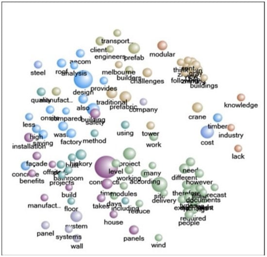 Furthermore, cluster analysis in NVivo was used to assess and group sources or nodes that share similar words. The sources or nodes clustered together in the cluster analysis diagram have higher similarity based on the occurrence and frequency of similar words. Sources or nodes with lower similarity are far apart. The size of each node indicates the number of words included in the text of the node. By selecting all interview content related to 23 challenges and selecting those clustered by word similarity and Pearson correlation coefficient, the key clusters were then generated through the cluster analysis function in NVivo Pro 12. The content in the interview files was grouped into eight clusters and presented in different colours, as shown in Figure 1. The words representing each cluster are identified as “design”, “construction”, “lifting”, “challenges”, “systems”, “material”, “quality” and “knowledge”, respectively. These words are considered as a reference for the classification of the 23 challenges in Section 4.2.