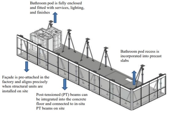 For prefabrication types, some leading prefabrication companies are applying volumetric systems in building projects. They might be structural elements, architectural elements or service elements. One typical example of a volumetric system is bathroom pods. Some leading companies are also applying hybrid prefabrication systems, which are three-dimensional systems combined with other units or systems []. A typical example of a hybrid system is the Hickory Building Systems (HBS), as shown in Figure 2, which is a patented building technology. Both systems are increasingly demonstrating their ability to reach multi-level []. Furthermore, mass timber construction is typically used in applications as a substitute for concrete and steel, and some Australian companies have used mass timber for public buildings and residential housing construction [].