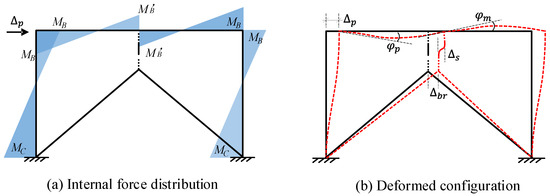 Figure 2 depicts the internal force distribution and deformation mode of the eccentrically braced composite frame structure with a vertical shear link. The maximum bending moment of the frame column is distributed at both ends of the column, which are represented by
