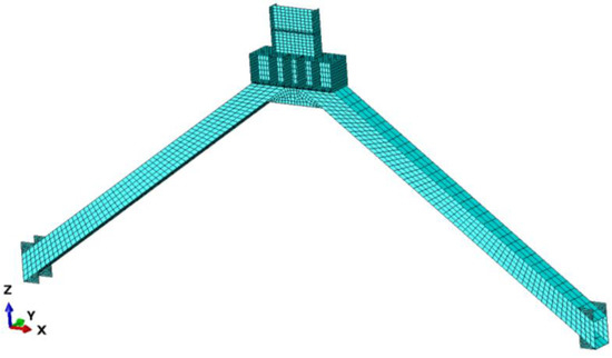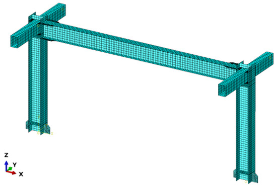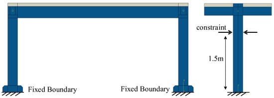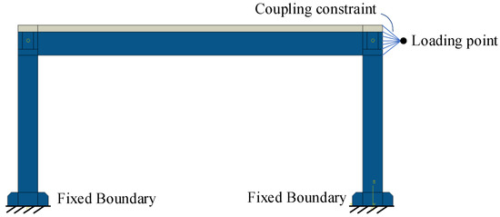The bottom of each specimen was fixed to the ground beam using high-strength bolts. The bearing capacity of the high-strength bolt group was higher than the design shear force and bending moment at the bottom of the frame column in the design. The slip and separation between the end plate at the bottom of the specimen column and the ground beam were not observed during the test. Therefore, the bottom of the specimen can be regarded as a fixed boundary condition to constrain the degrees of freedom in all directions in the finite element model. The degree of freedom in the out-of-plane translation direction of the model was limited to the height of the frame column (1.5 m) to control the out-of-plane deformation of the specimen.