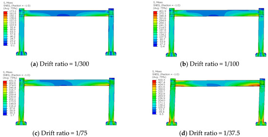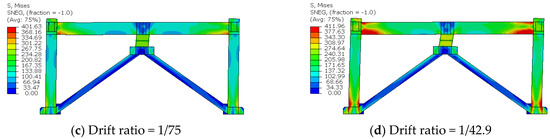 Figure 8 shows the stress nephogram of the steel frame of specimen 1 at a typical displacement ratio. The areas with large stress are mostly concentrated near the node at the beam end and the bottom of the column, and the stress at the beam end is slightly higher than the stress at the bottom of the column; therefore, the beam end yields before the column end. The numerical simulation results are consistent with the experimental observation results. The drift ratio is calculated using the deformation to height ratio. At a drift ratio of 1/100, the maximum stress at the end of the steel beam is 367 MPa, indicating that the frame beam has yielded at this time, whereas the maximum stress at the end of the frame column is 281 MPa, indicating that it has not yet yielded. When the drift ratio reaches 1/75, the maximum stress at the bottom of the frame column is 355 MPa, which exceeds the yield stress of steel and indicates that the frame column has entered the yield stage. When the drift ratio reaches 1/37.5, the beam end and column bottom end of the structure have all yielded and entered the strengthening stage, indicating that the structure formed plastic hinges and failed.