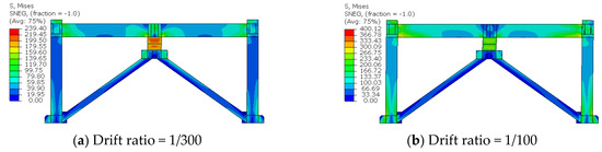 Figure 9 depicts the stress cloud diagram of specimen 2 at a typical drift ratio. When the drift ratio is 1/300, the steel frame remains in the linear elastic range, and the stress level is low. In contrast, the equivalent force level of the connecting beam member has reached 240 MPa, indicating that the connecting beam has begun to yield. This is consistent with the experimental observations. When the drift ratio reached 1/300, the tangent of the hysteresis curve of specimen 2 began to decrease. The structure already has a certain energy dissipation capacity because of the yield of the connecting beam. When the drift ratio reaches 1/100, the connecting beam undergoes obvious shear deformation, and its webs and flanges have yielded, indicating that it has completely entered the state of yield energy consumption. Under this condition, the maximum stress of the steel frame part is mainly concentrated at the end of the steel beam and the bottom of the column. The maximum stress at the end of the steel beam is 378 MPa, indicating that the steel beam has just entered the yield state, whereas the stress level at the bottom of the column is 301 MPa, indicating that the connecting beam has not yielded. Furthermore, the stress level at the bottom of the steel and the lower edge of the steel beam in the middle of the span are both relatively high, reaching up to 318 MPa, which is consistent with the test results. This is because of the additional bending moment caused by the vertical connecting beam in the middle of the span. When the drift ratio reaches 1/42.9, the frame beam and the column both yield and enter the strengthening stage. The plastic hinge of the structure is formed at both the end of the frame beam and the column, and the structure will fail soon.