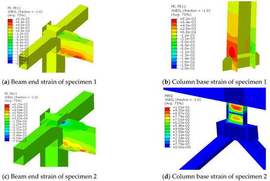 Figure 10a,b illustrates the local plastic strain nephograms of the beam end and bottom of the column when the failure drift ratio of specimen 1 has been reached. The following simulation results are consistent with the experimental results. The maximum plastic strain at the beam end is located at the flange widening. Obvious buckling or tearing failure initially occurred at the flange widening during the test. The maximum plastic strain at the column end is located at the upper part of the column end stiffener. When failure occurs, the column flange at the upper part of the column end stiffener exhibits out-of-plane buckling deformation. For specimen 2, when the structural drift ratio reaches 1/42.9, the shear link fails owing to excessive shear deformation, and the lower edge of the steel beam at the end of the beam undergoes relatively obvious buckling and tearing damage, as shown in