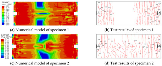 Figure 11, which is represented by the tension damage factor in the numerical model and crack distribution diagram in the experimental results. Evidently, there is good agreement between the numerical and experimental results. For the concrete slab of specimen 1, the damage area is mainly distributed at the beam end; the damage is smaller if the damage area is closer to the mid-span. The damage to the concrete slab of specimen 2 is distributed at the beam end and in the damage area on both sides of the installation position of the mid-span vertical shear link. This indicates that the introduction of eccentric support causes additional damage to the concrete slab.