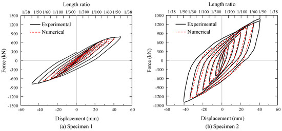 48]. Before the significant tearing of the lower edge of the steel beam, the numerical model analysis results are in good agreement with the experimental results. This verifies the accuracy of the model. In addition, the results of the numerical model analysis also demonstrate that compared to the conventional composite frame, the eccentrically braced composite frame with a vertical shear link has a fuller hysteresis loop, better energy dissipation capacity, higher bearing capacity and stiffness, and better seismic performance.