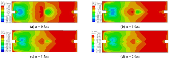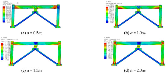α0, only a few areas of the beam end have yielded, whereas the bottom of the column and the beam–column joint area demonstrate yield and plastic deformation. Although an increase in the beam-to-column linear stiffness ratio is conducive to reducing damage to the frame beam, the damage to the frame column and joint area increased, which is not conducive to achieving the design concept of strong columns and weak beams.