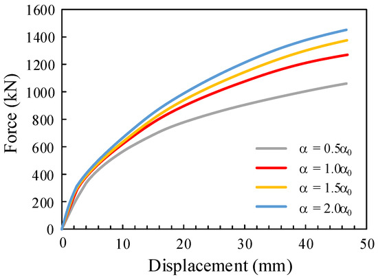 Figure 27 shows the load–displacement curves of the structure for different diagonal brace stiffnesses. The development trend of each curve is essentially identical.