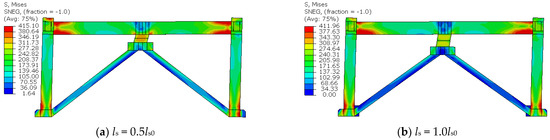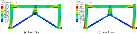 Figure 16 illustrates the stress nephogram of the steel frame when the structure fails under different shear link lengths. The length of the shear link has no discernible effect on the stress distribution at the beam end and bottom of the column. Changes in the shear link length have a considerable impact on the stress state of the mid-span steel beam. At a short shear link length, the stress level of the lower edge of the mid-span steel beam is high, and the stress of the diagonal brace increases slightly. Therefore, when the shear link length is short, the thickness of the lower edge plate in the middle of the steel beam span and the strength of the diagonal brace should be increased proportionally.